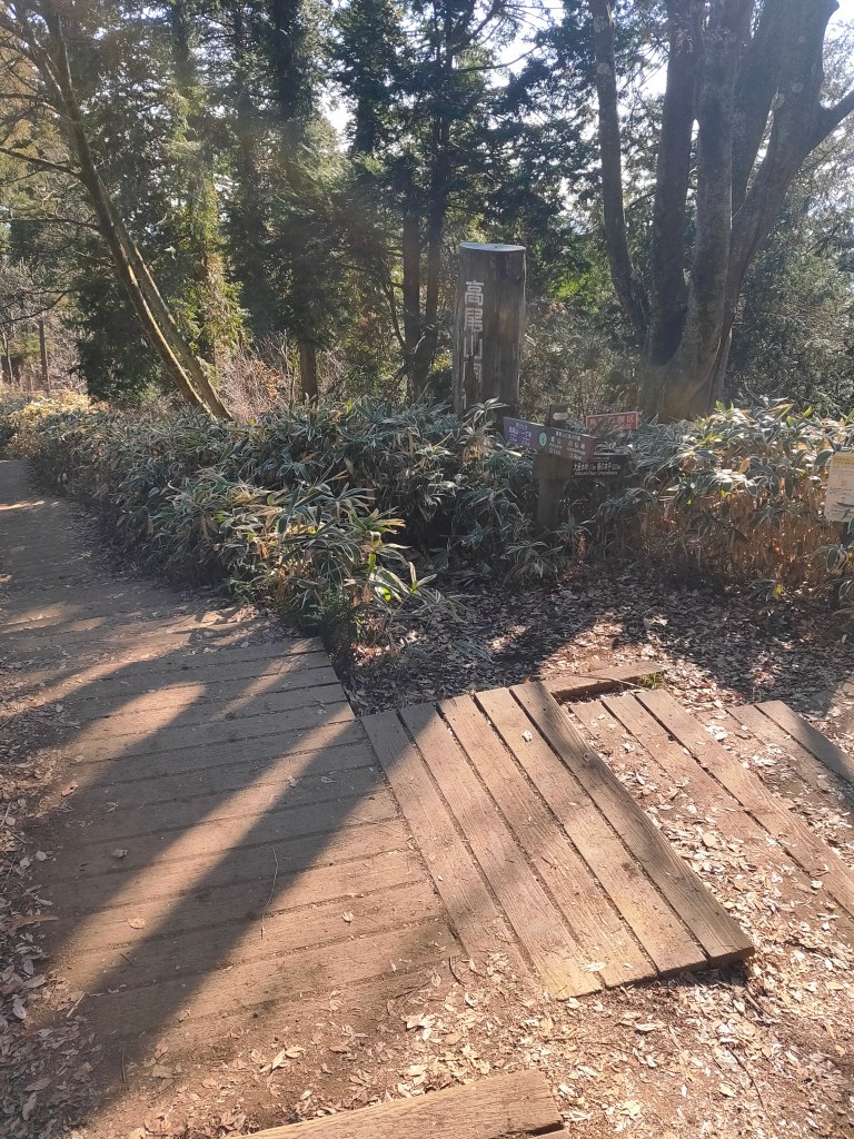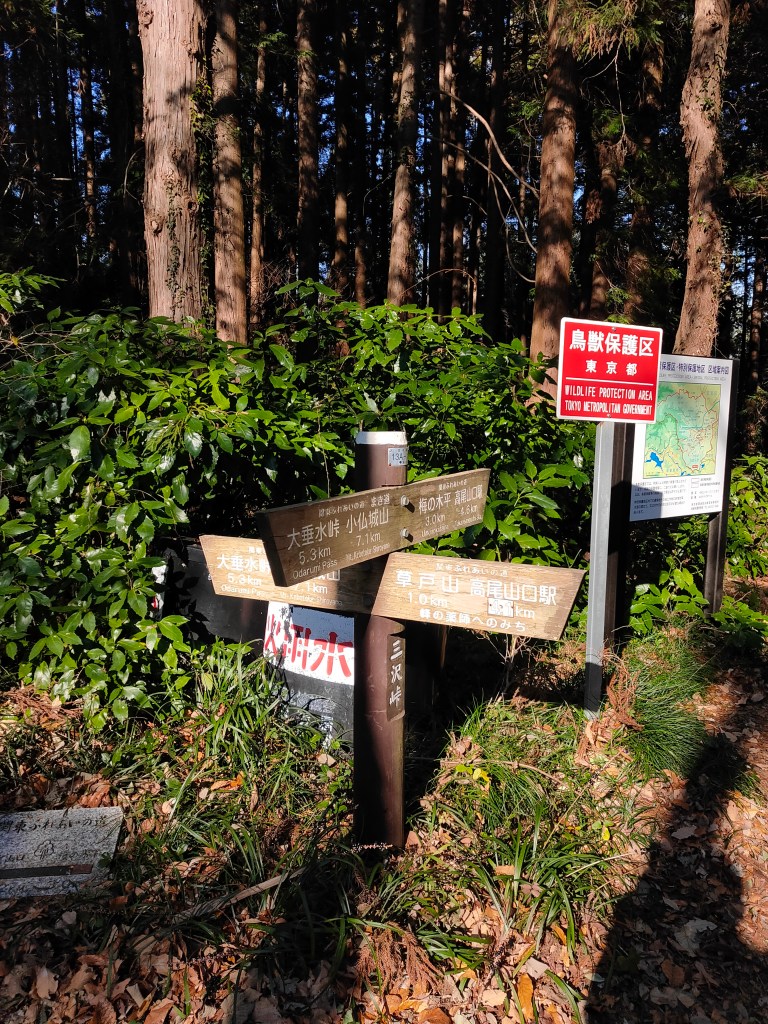ここから梅ノ木平方面に向かって進みますが、梅ノ木平自体には行きませんのでご注意を。三沢峠の交差点で、草戸山/高尾山口駅方面に向かってください。この先、看板の表記に「高尾山口駅」と「高尾駅」とブレがありますが、気にせず進みましょう。